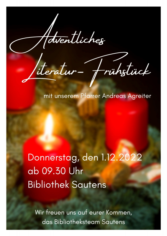 Am Donnerstag, den 01.12.2022 ab 09:30 findet in der Bibliothek Sautens ein adventliches Literatur-Frühstück mit Pfarrer Andreas Agreiter statt. Wir freuen uns auf viele Besucher:innen!
